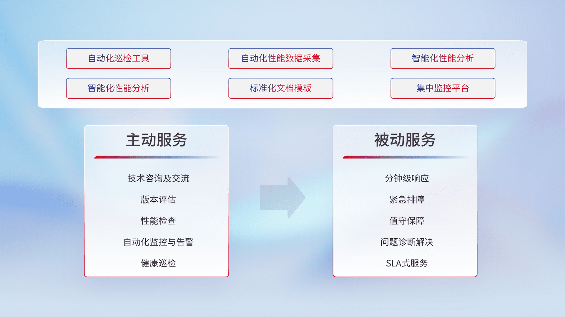 智能化工具和标准化文档,,保障服务质量,,,,提供主动服务(包含技术咨询、、版本评估、、、、性能检查、、自动化监控与告警、、、、健康巡检)和被动服务包含(分钟级响应、、紧急排障、、、值守保障、、、问题诊断解决、、SLA服务)。。。。